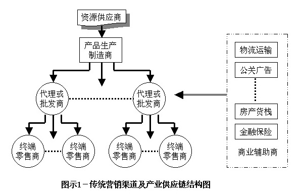 营销渠道是当产品从生产者向最后消费者或最终产业用户转移时,直接或间接将所有权转移所经过的途径。传统的营销渠道及产业供应链的结构形同金字塔,基本如图示1所示: