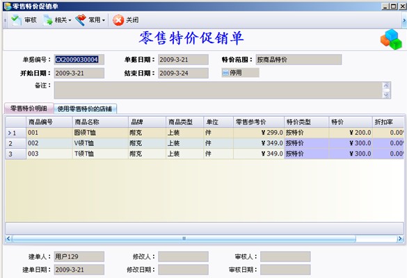 1、在列表窗口查询并选定要需要的零售特价单,点击工具栏上的“审核”按钮。如下图。